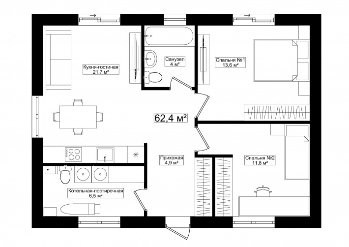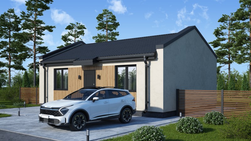 Компактный функциональный одноэтажный дом с оригинальным фасадом и двухскатной кровлей. Имеет две спальни, кухню гостиную с выходом на задний двор, котельную-постирочную, второй санузел можно разместить в котельной постирочной.