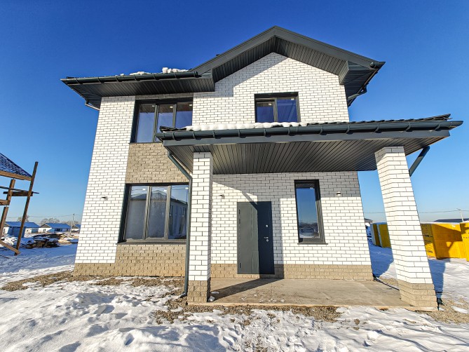 Двухэтажный коттедж в современном стиле с фасадом из облицовочного кирпича. Правильной формы небольшой дом легко вписывается в любой ландшафт и в земельные участки произвольного размера. Особенность дома — большие окна, которые пропускают много света и делают пространство внутри более светлым и воздушным.